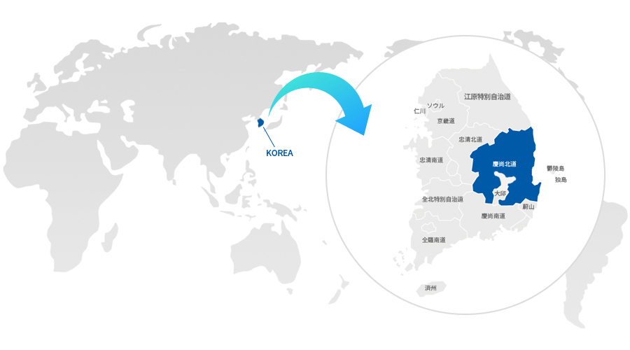 慶尚北道(キョンサンブクド)は、朝鮮半島の東南部に位置し、東側は東海岸、北側は江原,忠北、西側は忠北,全北、南側は慶南,蔚山と接している。 首都ソウルから半徑170-430㎞に位置し、航空、高速銑道、高速道路など立体的な交通網により50分から3時間以内の便利な接近性を持っている。 北緯35°34′から37°33′に位置し、アメリカのワシントンDC、日本の東京、中国の蘭州、イランのテヘラン、ポルトガルのリスボンなどと同じ緯度上にある。